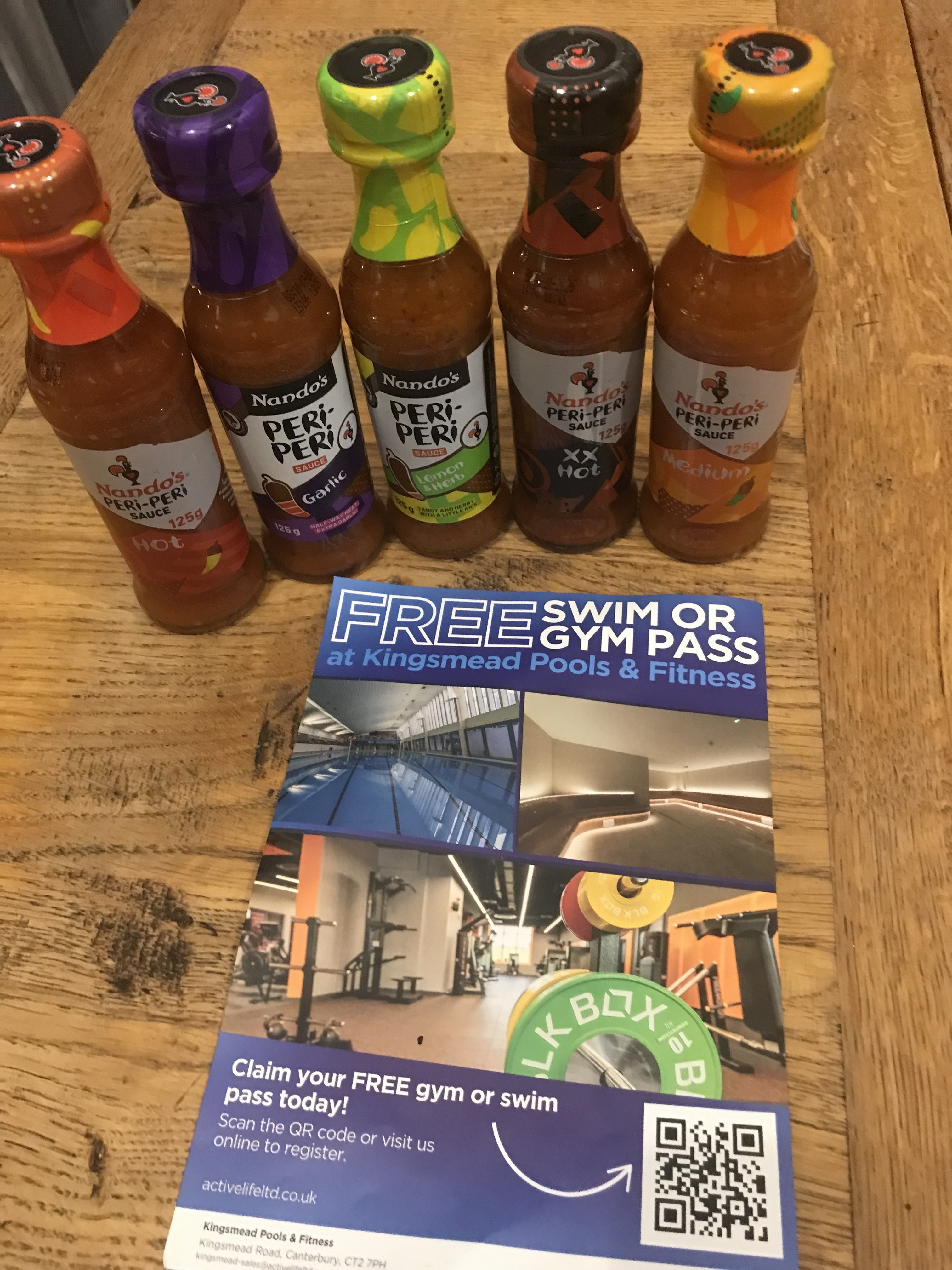 ![]() Free Swim or Gym PassEnjoy a complimentary swim or gym session at Kingsmead Leisure Centre. Whether you fancy unwinding in the pool or getting energised in the gym, this flexible pass lets you choose how you’d like to feel refreshed. A great treat including 6 delicious Nando's sauces! 🏊♂️