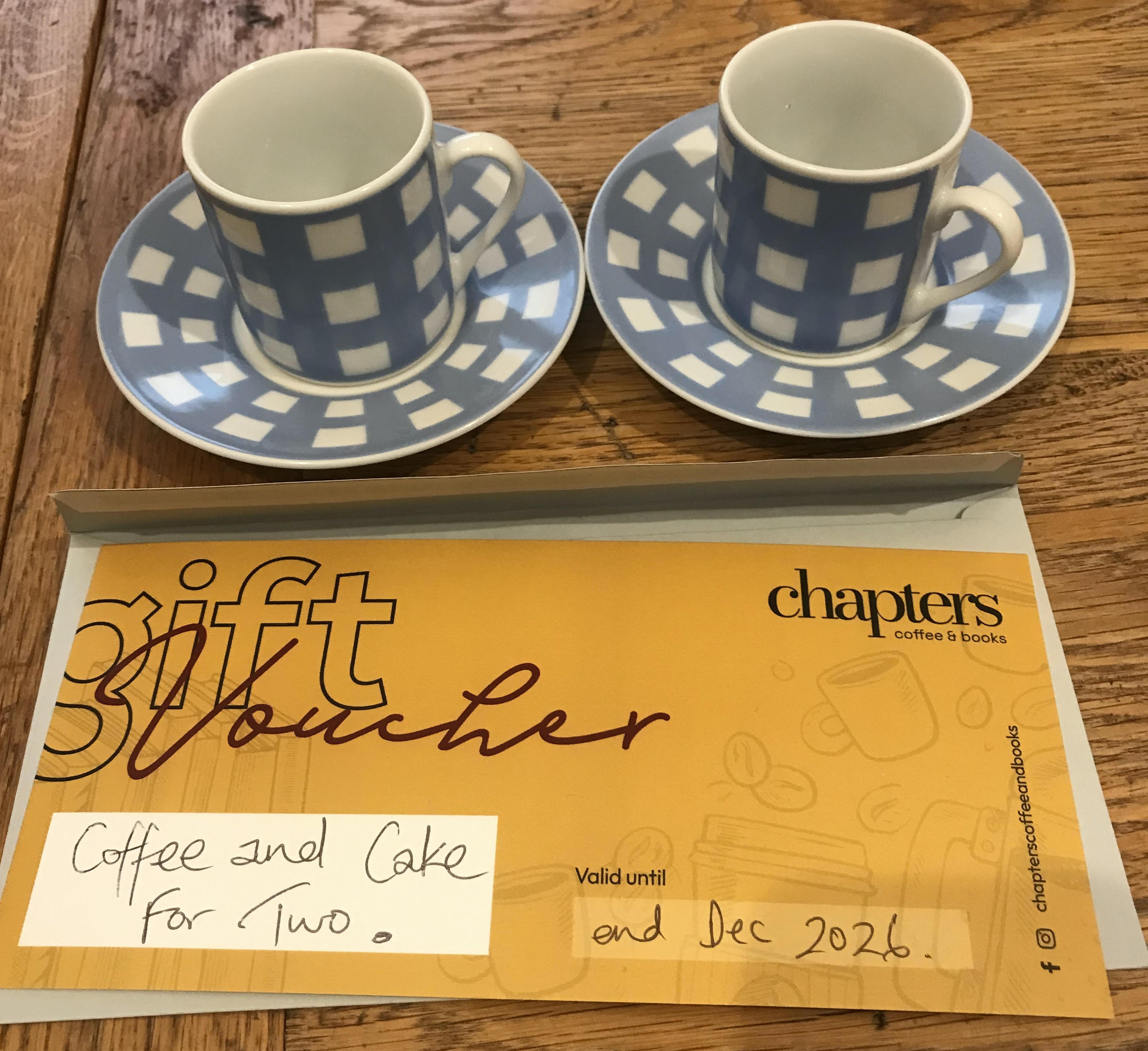 ![]() Coffee & Cake for Two ☕🍰Enjoy a cosy treat for two at Chapters Coffee & Books in Sturry, Canterbury. This prize offers coffee and cake for two people, giving you the perfect opportunity to relax, unwind, and enjoy the warm, welcoming atmosphere of this much-loved community café. This prize also includes two espresso coffee cups and saucers, perfect for enjoying your favourite brew at home.